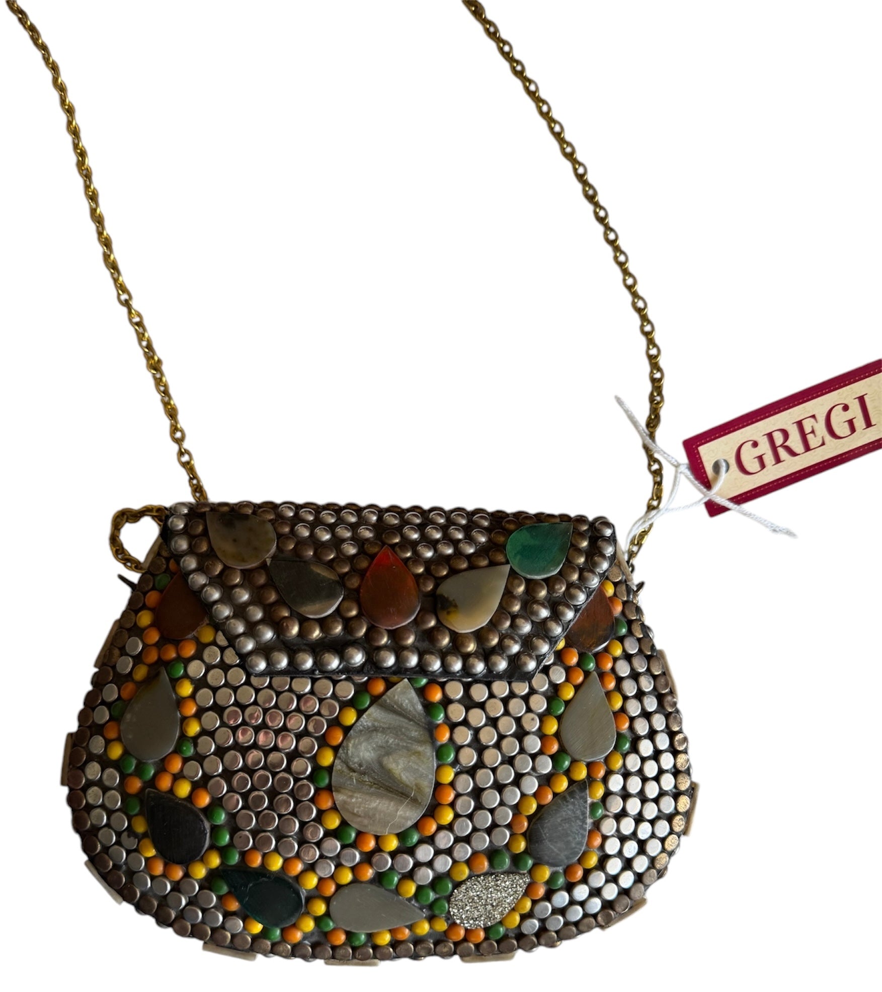 Bolsa artesanal, multicolor, con piedras, cadena metálica