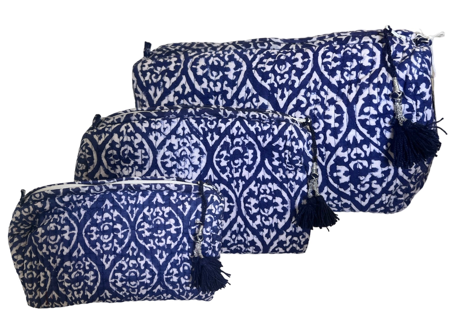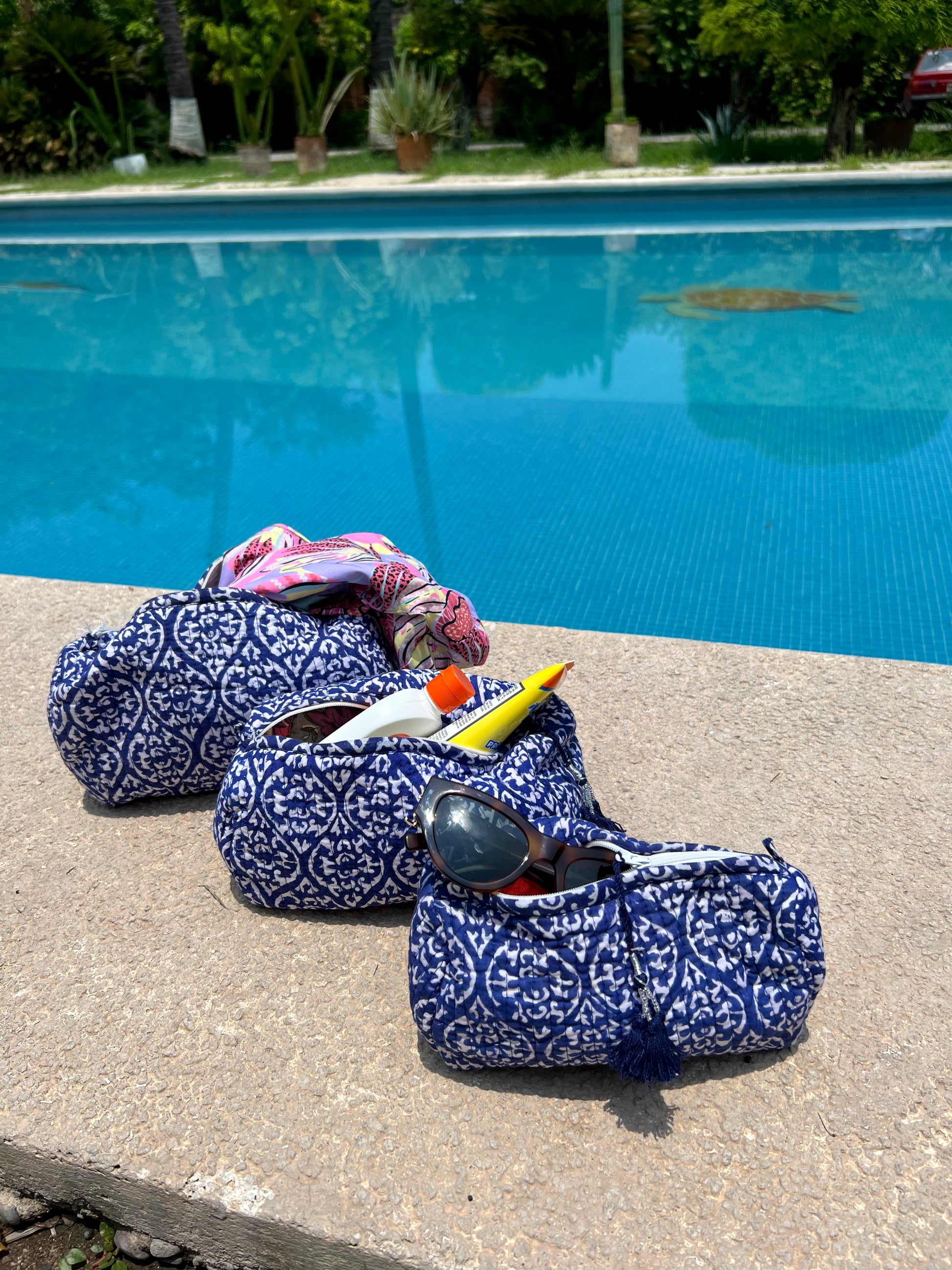 Set de neceser 3 piezas, resistente al agua, 100% algodón, estampado a mano, con cierre externo.
